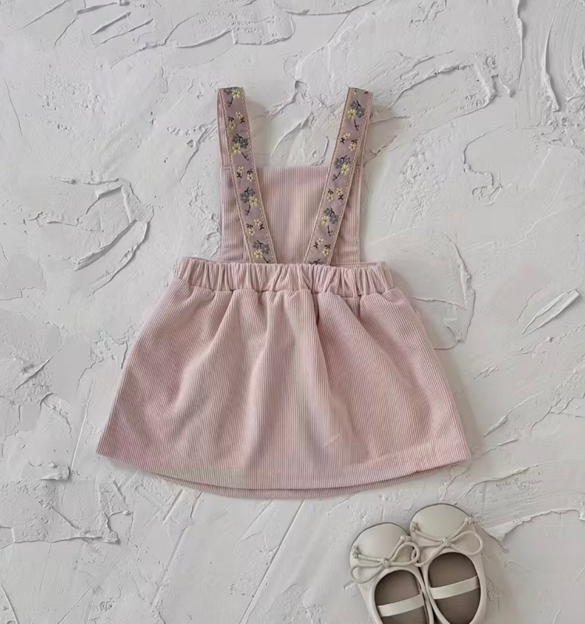 Apron-style dress with floral detailed straps and front pockets